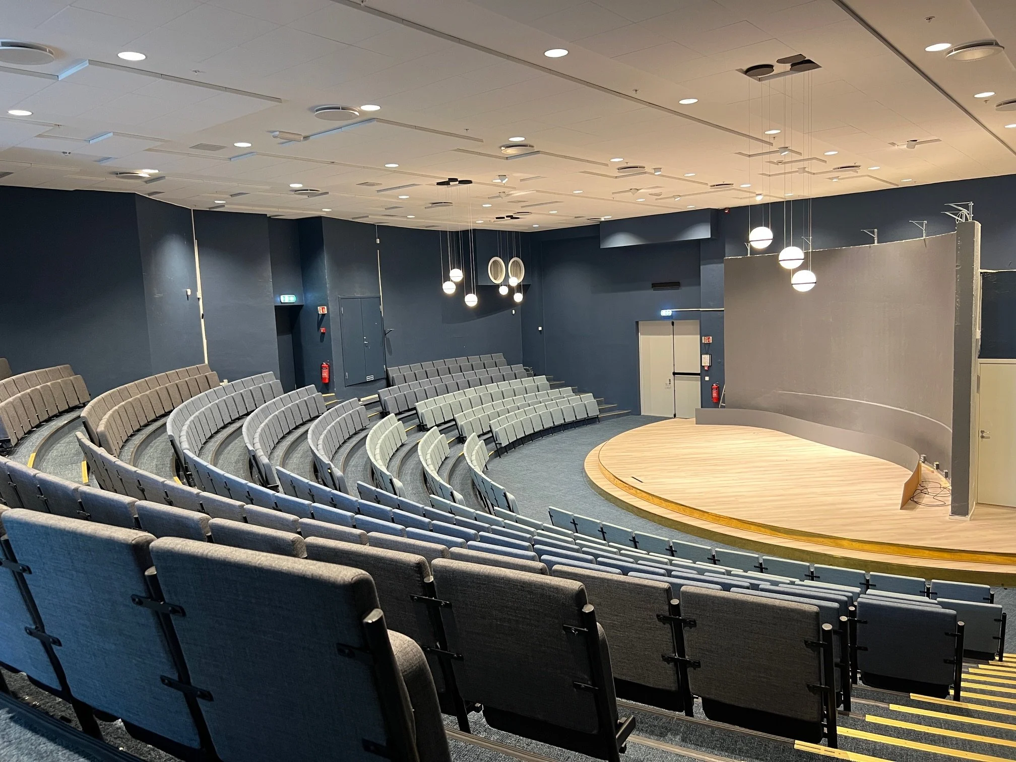 Auditoriet har kapasitet for 270 personer og egner seg godt til store møter og konferanser. Rommet har nytt AV-utstyr med kraftig projektor og mulighet for strømming til ønsket plattform, samt et godt lydanlegg med inntil 8 mikrofoner.